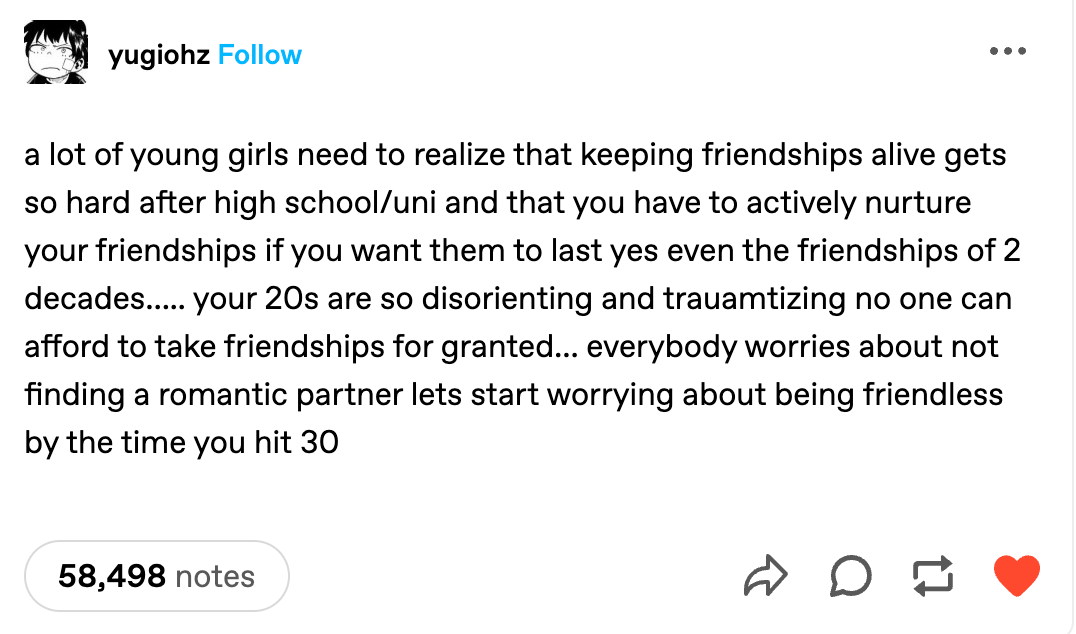 I think a part of having friends as an adult, is the mutual understand and acknowledgement that your friends also live their own lives. As you are the main character in your life, they are the main character in theirs, with their unique individualized commitments and responsibilites and dreams and ambitions. They are exploring and navigating life alongside you, but you know you have the other one close by.